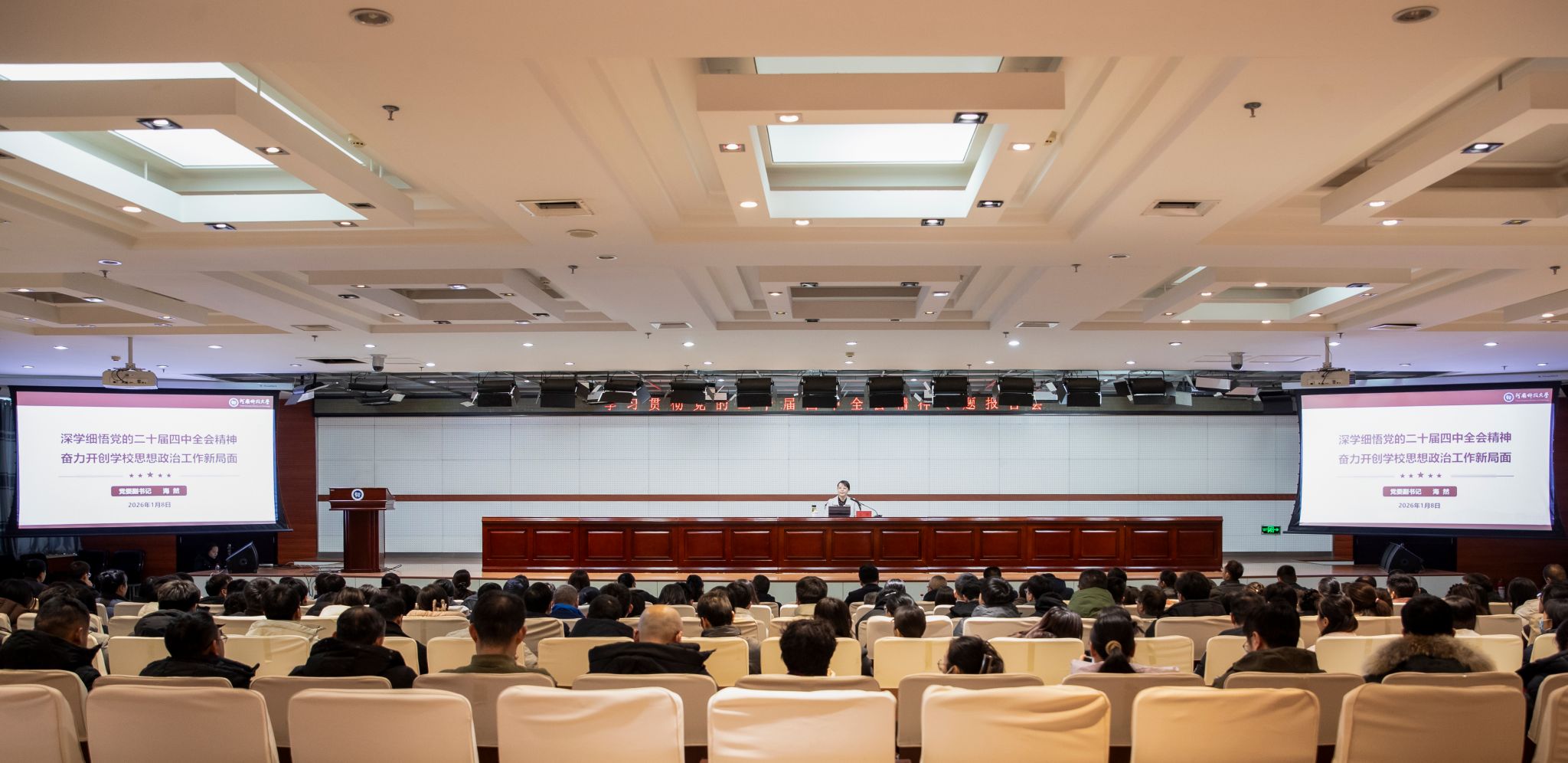 校新闻中心讯 按照学校学习宣传党的二十届四中全会精神工作安排,为推动全会精神在学校思政工作一线落地生根,1月8日,党委副书记海然以“深学细悟党的二十届四中全会精神 奋力开创学校思想政治工作新局面”为题,为全校宣传和学工干部、全体辅导员讲授专题思政课。