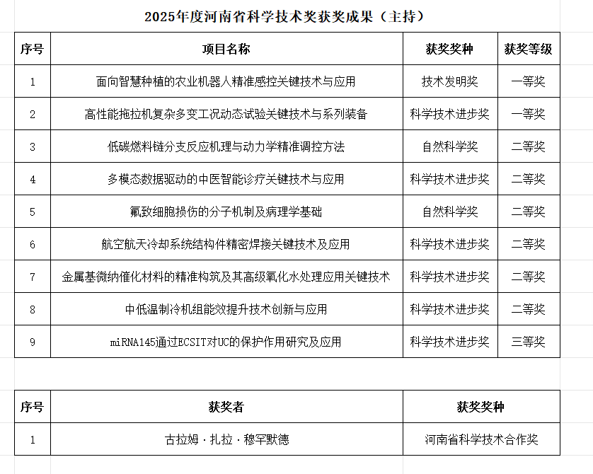 校新闻中心讯 近日,2025年度河南省科学技术奖励评审结果揭晓,我校共获奖21项。其中,一等奖5项(主持2项)、二等奖12项(主持6项)、三等奖3项(主持1项)、国际合作奖1项。获奖总数及主持一等奖数量均位居全省高校前列,有力展现了学校在“双一流”大学创建中的科研创新实力与核心竞争力,为学校高质量发展提供了强劲动能。